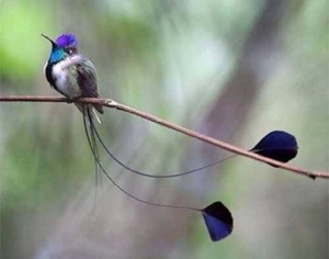 This Hummingbird is known as Marvellous spatuletail and is found only in the forest edges of a remote valley in northern Peru. They only have 4 tail-feathers and the male has 2 that have a violet-blue elongated disc at the tip. These are waved frantically around in a mating dance to attract a female and to prove that the owner is a good catch.