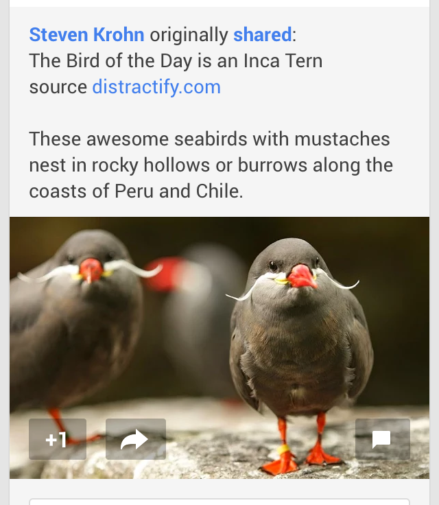 Inca Tern 17 Wednesday Sep 2014 Posted by Caro Field in poetry ≈ Leave a comment The very lovely Inca Tern, From Chile and Peru. Maybe if you nested there, You’d have a moustache too! 51.426483 -0.068697 Share this: Click to share on X (Opens in new window) X Click to share on Facebook (Opens in new window) Facebook Click to share on LinkedIn (Opens in new window) LinkedIn Click to email a link to a friend (Opens in new window) Email Click to share on Pinterest (Opens in new window) Pinterest Like Loading...