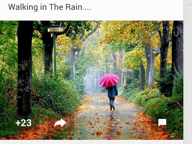 Walking in the Rain 04 Saturday Oct 2014 Posted by Caro Field in poetry ≈ Leave a comment Trees leaching leaves, Which crumple underfoot. A breeze from the west Carries the scent of wet earth. I’m just walking, walking, In the rain. 51.426492 -0.068686 Share this: Click to share on X (Opens in new window) X Click to share on Facebook (Opens in new window) Facebook Click to share on LinkedIn (Opens in new window) LinkedIn Click to email a link to a friend (Opens in new window) Email Click to share on Pinterest (Opens in new window) Pinterest Like Loading...