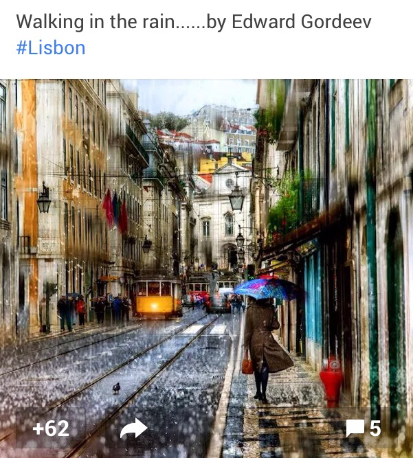 Lisbon 24 Thursday Sep 2015 Posted by Caro Field in poetry ≈ Leave a comment Walking in the rain, With the world washed anew And the trams skimming along Throwing up vapour trails. The city seems brighter, Lighter, Even with the lowering skies. © Caro Ness 2015 Share this: Click to share on X (Opens in new window) X Click to share on Facebook (Opens in new window) Facebook Click to share on LinkedIn (Opens in new window) LinkedIn Click to email a link to a friend (Opens in new window) Email Click to share on Pinterest (Opens in new window) Pinterest Like Loading...