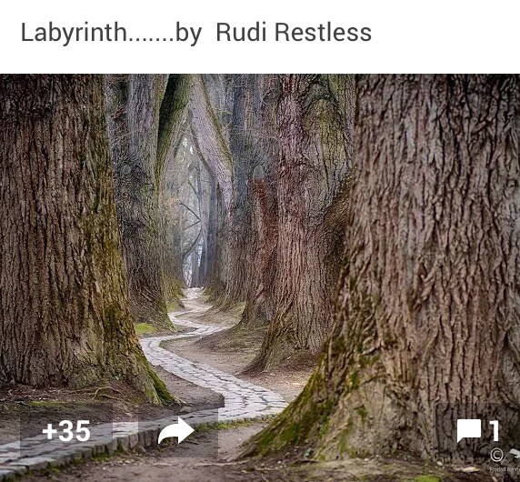 Labyrinth 29 Tuesday Sep 2015 Posted by Caro Field in poetry ≈ Leave a comment Step into the labyrinth And each tree is identical No identifying features Just a uniform path Stretching out of sight © Caro Ness 2015 Like Loading...