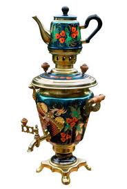 Tea is probably Russia’s favourite drink after vodka! It is made and served in teapots or samovars – a Russian tea kettle, which are often decorated with images from folk lore or fairy tale. Some tea drinkers use three teapots that sit on top of one another. The middle pot usually holds strong black tea, the small pot on the top holds herbal or mint tea, and the large pot on the bottom holds hot water. The teas can be mixed with each other and diluted with hot water as each cup is poured. Everyone can mix the type of tea they like. Tea is drunk from cups but more often Russians use a podstakanniki – a special glass in a silver holder and the tea is usually drunk after meals rather than with a meal, but when tea is made using a samovar it is ready for use throughout the day. A samovar is shaped like an urn and there is a special place for a small teapot to sit on the top. Water is heated in the samovar and a strong dark tea is made using lots of tea leaves in the teapot on top. The strong tea is called zavarka. The tea is so strong that it has to be diluted with water from the samovar before it can be drunk. A drop of tea is mixed with hot water taken from the tap or spout on the front of the samovar. As the water is used you need to refill the samovar and every few hours you have to make a fresh pot of black tea. Some samovars are small and only hold about three litres of water but some can hold up to 30 litres. Samovars are usually made from metal and are commonplace in a Russian home or restaurant.